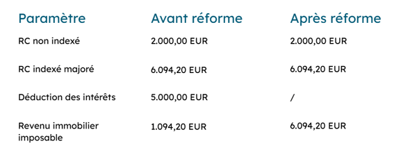 Avant la réforme, la déduction des intérêts entraînait une économie d’impôt d’environ 1.861,36 EUR. Après la suppression, Jacques devra acquitter environ 651,32 EUR supplémentaires d’impôt, soit une différence de rendement de l’ordre de 2.512,68 EUR.