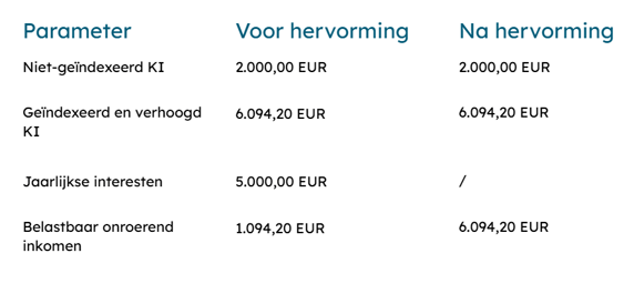 Voor de hervorming leidde de interestaftrek tot een belastingsbesparing van ongeveer 1.861,36 EUR. Na de afschaffing zal Jacques daarentegen circa 651,32 EUR extra belasting verschuldigd zijn, wat neerkomt op een rendementsverlies van 2.512,68 EUR